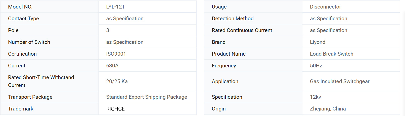 LYL-12T karga etengailuak GB3804-2004 "3.6kV ~ 40.5kV altuko tentsioko karga etengailua" eta GB16926-1997 "AC goi-tentsioko karga etengailua-fusible konbinazio aparatuaren" eskakizunak betetzen ditu. Zirkuitu nagusia: 630A-20kA (4s), 25kA (3s); Bizitza mekanikoa: 5000 aldiz; Lurreratze zirkuitua: 20kA (2s); Bizitza mekanikoa: 2000 aldiz.