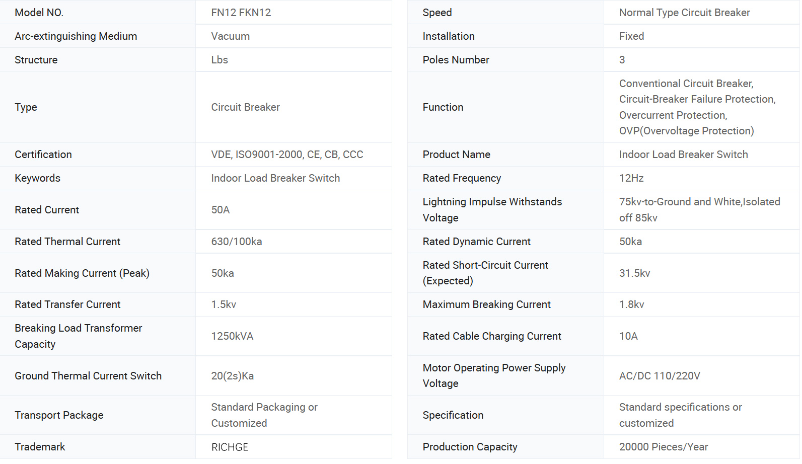 FKN12-12R.D/100-31.5 motako barruko AC tentsio handiko karga etengailu-fusible konbinazioa FKN12-12D karga etengailua eta XRNT ataka-12 goi-tentsioko korronte mugatzailearen fusiblea konbinatzen dituen tentsio altuko etengailua da. Zirkuitu-labur-korronteraino edozein korronte hautsi dezake fidagarri: karga-etengailuak lan-korrontea apurtzen du, fusibleak zirkuitu-labur-korrontea apurtzen du eta elkarrekin lan-korrontearen eta zirkuitu-korronte osoaren arteko gainkorrontea hausten du, eta fusibleak karga-etengailua irekita dago.
