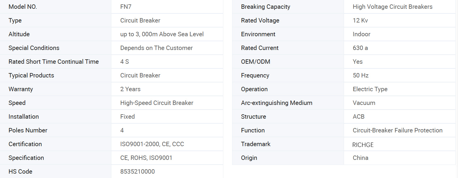 FN7-12 AC goi-tentsioko karga etengailua gasa sortzen duen barruko tentsio handiko karga etengailu mota berria da. AC 50Hz eta 12kV-ko tentsio nominala duten sistema trifasikoetarako egokia da. Karga-korrontea apurtzeko eta zirkuitu-labur-korrontea ixteko erabiltzen da.