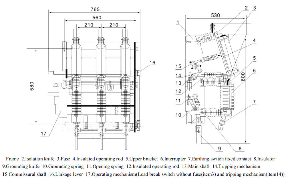 FZN21-12 serieko tentsio handiko hutsezko karga etengailua batez ere fameroz osatuta dago, deskonektatzeko etengailua (Konbinatzailearen uneko mugatzailea deskonektatzeko etengailuan dago), hutsean aldatzeko hodi, lurreratzeko etengailua, udaberriko funtzionamendu mekanismoa eta abar. Produktu honek egitura trinkoa du, bolumen txikia, bizitza luzea, itxiera eta hausteko gaitasun sendoa eta funtzionamendu eta mantentze erraza. Vacuum Switch-ek udaberriko mekanismoarekin hornituta dago. Motor elektrikoa (beste eskuliburu bat) udaberriko energia biltegiratze bat hartzen du eta bi metodo mota daude: elektromagnet ixteko eta eskuzko zatitzea eta itxitzea. Deskonektatzeko etengailua, hutsezko etengailua eta terraza etengailua elkarren artean elkarren artean lotzen dira (elkarretaratze mekanikoa) ezarrizkoa ekiditeko.