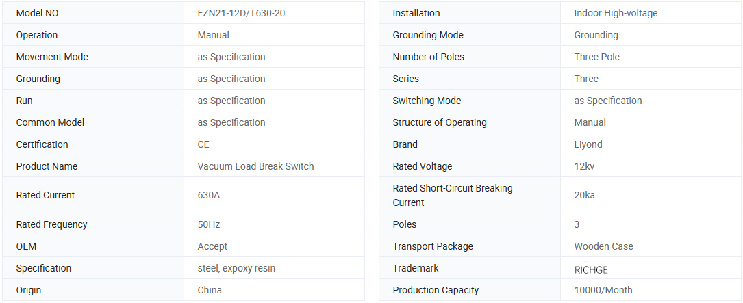 FZN21-12D / T630-20 Barrualdeko tentsio handiko hutsean karga-etengailua, PowerSupply Sarerako egokia da 10KV-ko hiru faseko 50Hz-ko tentsioarekin, karga korrontea apurtzeko erabiltzen dena.