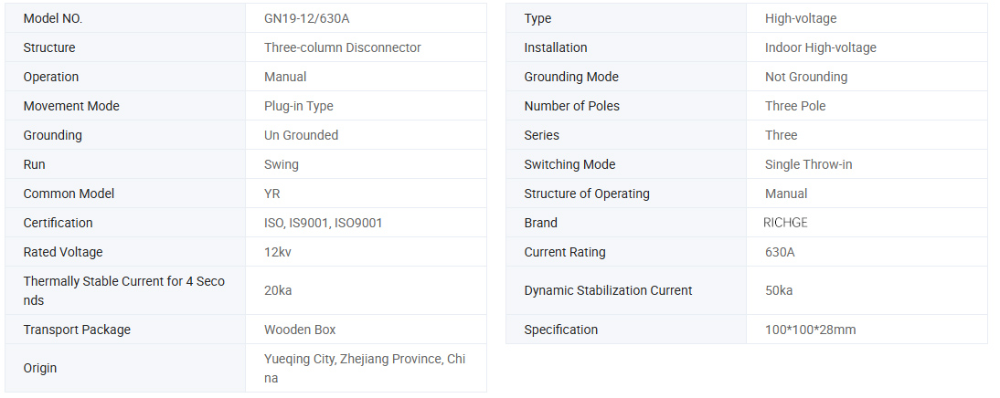 GN19-12(c) serie barruko AC tentsio handiko isolamendu etengailua AC 50hz, tentsio nominala 12kv eta azpiko potentzia sistemarako egokia da, CS6-1 eskuz funtzionatzeko mekanismoarekin hornituta dago eta zirkuitua apurtzeko eta kargarik gabe egiteko erabiltzen da. Kutsadura mota, altuera handiko mota eta potentzia adierazteko mota osagarriak daude. IEC 62271-102 arauaren arabera egina dago. Etxetresna elektrikoak tentsioaren baldintzapean aldatzeko erabiltzen da, baina kargarik gabe. Era berean, instalatu daitezkeen anti-fouling mota, plater mota eta zuzeneko bistaratzeko gailuak ekoizteko bidaltzen dira. GN19-12 serie barruko tentsio handiko etengailu isolatzailea 12kv-ko tentsio nominala eta AC 50hz trifasikoa duen barruko gailua da.